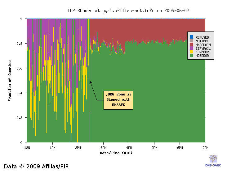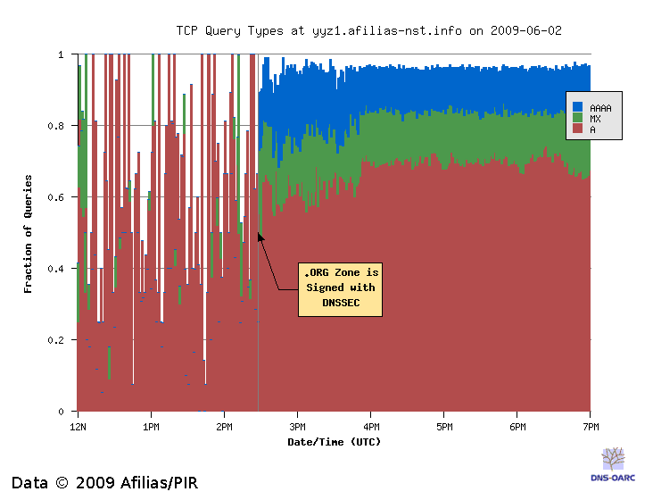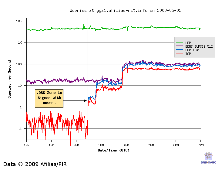 DNSSEC, EDNS and TCP using data from before and after the .ORG zone became signed.